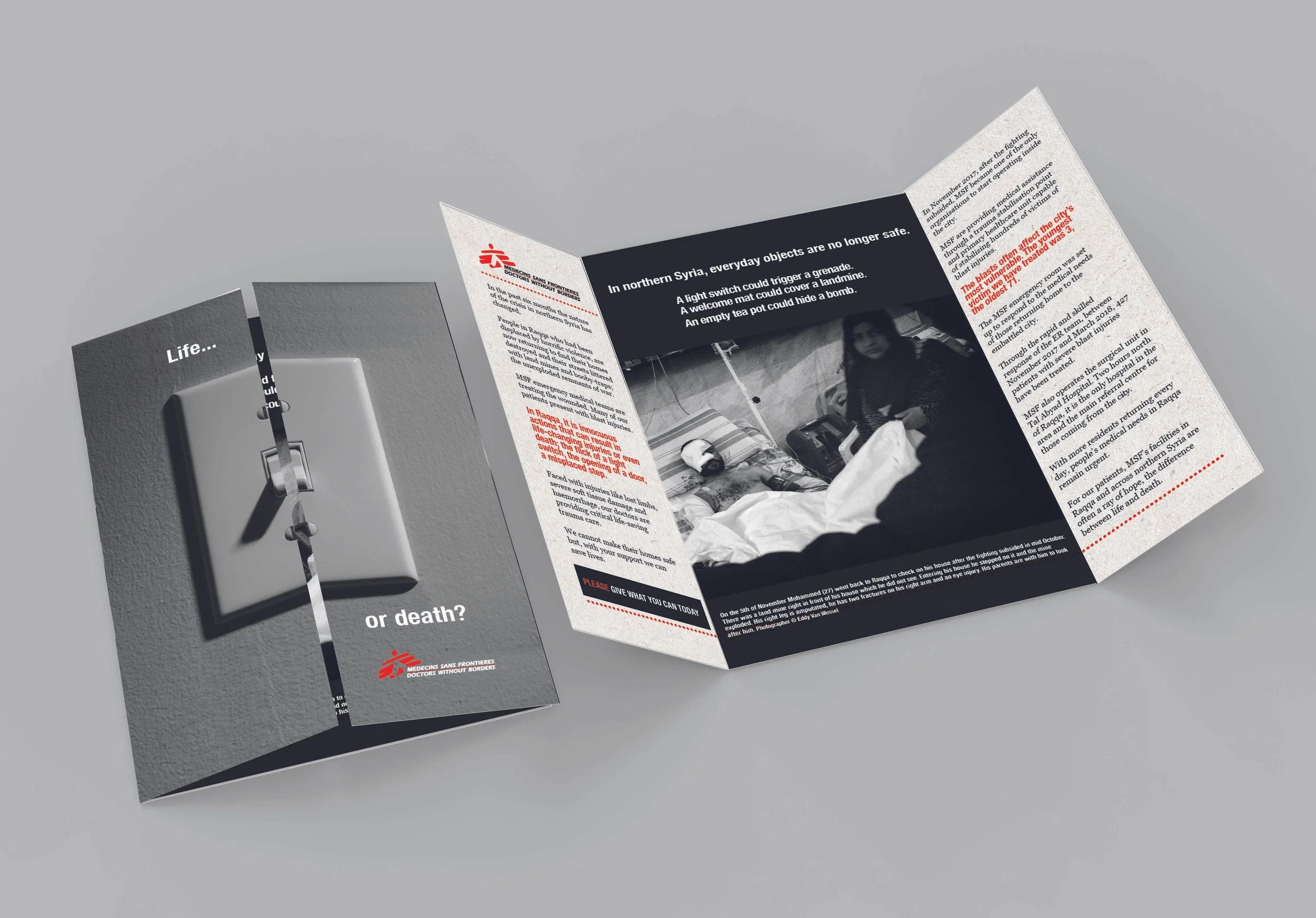 Médecins Sans Frontières/Doctors Without Borders (MSF) tasked us with bringing the work they are doing to treat blast injuries in this region to the attention of the Irish public. I wrote the copy for this impactful direct mail piece, a departure for MSF who usually feature field photography in their communications.
